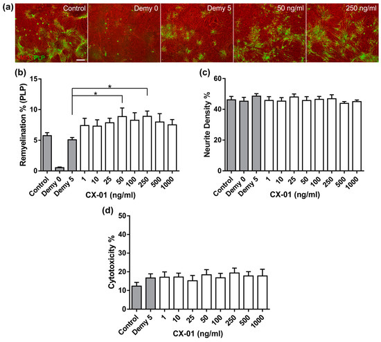 We also assessed the effect of CX-01 in MC-Demy using a titration ranging from 1 ng/mL to 1000 ng/mL. Treatment with CX-01 resulted in a significant increase in remyelination compared to the non-treated demyelinated control cultures (Demy5) at 50 ng/mL and 250 ng/mL (Figure 5a,b, p = 0.02). CX-01 had no effect on neurite density (Figure 5c). We also assessed if CX-01 was cytotoxic, by testing the growth medium after drug treatment. CX-01 was found not to be cytotoxic to the cultures supporting its potential use in treating neural cells (Figure 5d).