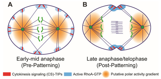 Two sides of the same coin? (A) Cytokinesis signaling molecules localize to the plus-ends of astral MTs (referred to as cytokinesis signaling (CS)-TIPs; shown in red) within minutes of anaphase onset and activate RhoA (shown in blue) upon cortical contact. In this model, a putative polar gradient (shown in orange gradient) inhibits the localization of CS-TIP components to MT plus-ends. During the “Pre-Patterning” phase in early-mid anaphase, the polar gradient does not reach astral MT plus-ends and; therefore, astral MT plus-ends in both the polar and equatorial regions are capable of triggering transient RhoA activation. (B) The unexplained phenomenon of CS-TIP patterning involves the retention of CS-TIPs on equatorial astral MTs and the loss of CS-TIPs from polar astral MTs during late anaphase and telophase (referred to as ‘Post-Patterning’). In this model, polar CS-TIPs are lost as the spindle poles approach the polar cortex and the inhibitory polar gradient envelops polar astral MT plus-ends. Since the inhibitory polar gradient still does not reach the equatorial MT plus-ends, CS-TIPs in this area are retained and sustained RhoA activation supports cleavage furrow assembly and ingression in the equatorial region.