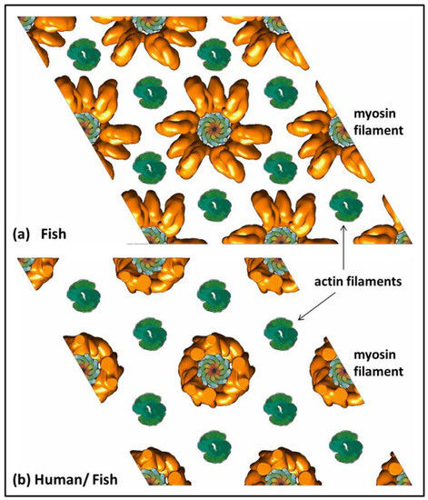 - AL-Khayat, H.A.; Squire, J.M. Refined Structure of Bony Fish Muscle Myosin Filaments from Low-Angle X-ray Diffraction Data. J. Struct. Biol. 2006, 155, 218–229. [Google Scholar] [CrossRef]