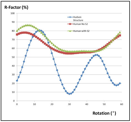 The calculated R-factor from the human heart muscle myosin filament in the fish muscle unit cell (red trace) showing a large variation with rotation angle relative to the unit cell axis. The analogous R-factor for the fish thick filament structure determined by Hudson et al. [10] is in blue. As expected, both R-factors are periodic because of the symmetry in the lattice and they repeat after 60°. Also included is the R-factor of the hybrid human system if the myosin S2 is also included. Inclusion of S2 gave a slightly poorer fit, but both human models with the interacting heads motif give very poor R-factors compared to the structure from Hudson et al. [10]. The R-factor for the chimera model was slightly improved if the 2D temperature factor was included (see text).