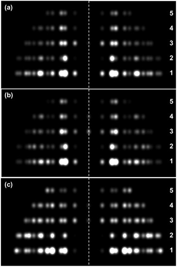Figure 5 compares the observed X-ray diffraction pattern from resting bony fish muscle (a) with the computed diffraction patterns from the model of Hudson et al. (b) [10] (Figure 3b,c), a hybrid structure with the EM density map of AL-Khayat et al. [26] placed in the fish muscle unit cell (Figure 3a). The best (lowest) R-factors obtained were R = 0.0786 (or 7.9%) for the model of Hudson et al. [10] and R = 0.54 (54%) for the human thick filament reconstruction in the fish muscle unit cell. Note that the R-factor value for fish muscle is different here from in Hudson et al. ([10]; 3%) because we are using a slightly different R-factor definition (see Equation (3)). Clearly the human structure is a relatively poor fit to the observed pattern, as Figure 4 and Figure 5 show. Figure 4 shows the variation of the R-factor with the rotation of the human thick filament models in the fish muscle lattice. This is a periodic function with equivalence every 60° because of the symmetry of the system (i.e., a hexagonal lattice, and a motif with approximate 9-fold rotational symmetry in projection down the c-axis). For the human chimera structure, the R-factor varied from R = 54% at its best to R = 78% at its worst. Even the best value is poor compared with the structure from Hudson et al. [10]. The fit was slightly worse (R = 56%) when the S2 part of myosin was included in the heart muscle structure as well (Figure 4). It is not clear whether S-2 should be included as part of the regular backbone or as part of the more variable head organisation on the three crowns. The fits were slightly better if a 2D lateral disorder factor (temperature factor) was included in (c) to give R = 32% rather than 56% with S-2 included. The mean radial displacement was 22 Å.
