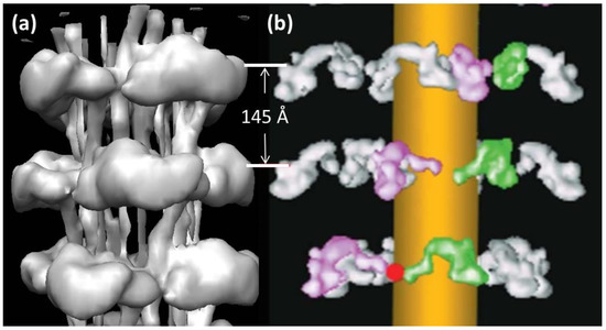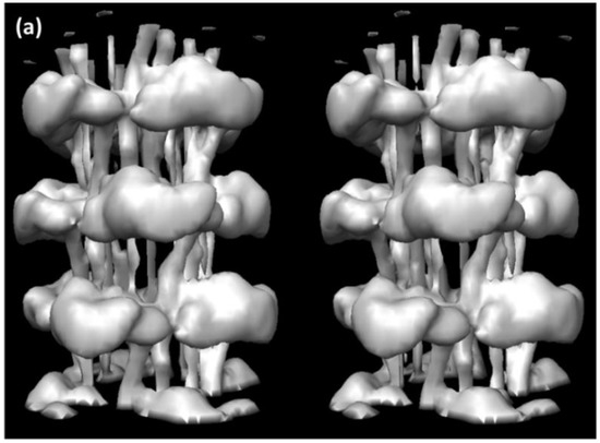 A 3D reconstruction of the thick filaments from Lethocerus flight muscle (Figure 7) was published by Hu et al. in 2016 [27]. This reconstruction had the remarkable property that the backbone structure was resolved to 6-Å resolution, enough to reveal the curved molecular crystal packing of the α–helical coiled-coil myosin rods in the backbone [30,33]. However, the head pairs were only resolved to about 25-Å resolution, presumably because of some inherent disorder in the head organisation. Because of a technical problem, they were unable to supply us with the coordinates of the head pairs. We have, therefore, used the protein density map produced by Hu et al. [27] (kindly provided to us by Kenneth Taylor, Florida State University) as a starting point with which to investigate the head arrangement in resting insect flight muscle.