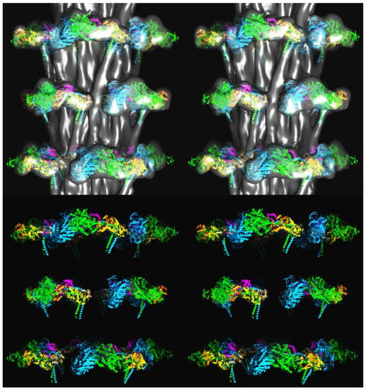 The models in Figure 8 shown looking down the filament axis, with the same colour coding. (Top) Density plus fitted model; (Bottom) Fitted model only. The head pairs form a good fit with a closed structure, as in the interacting head motif.