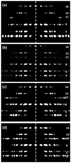 Comparison of the observed low-angle X-ray diffraction pattern (a) from relaxed insect (Lethocerus) flight muscle after processing (upper half of Figure 6a) and the simulated diffraction patterns from various versions of the insect myosin filament in the unit cell: (b) The published model from AL-Khayat et al. [11], R-factor = 9.7%; (c) The density map from Hu et al. [27] (Figure 7) put into the insect unit cell; R-factor = 33%, (d) The fitted atomic model with the interacting heads motif (Figure 8 and Figure 9), R-factor = 27%. (b–d) used the R-factor given in Equation (3). Layer-line numbering is based on the approximate 1160-Å axial repeat in insect flight muscle. Layer-line 3 was not used for the R-factor calculations, because both actin and troponin contribute to that layer-line as well. All patterns were scaled to give the same total intensity in the pattern, apart from (b) which is modified from the results of AL-Khayat et al. [11] and scaled to look similar to the other patterns. Introduction of a lateral (2D) disorder factor slightly improved the R-factors in (c) and (d) to 21% and 19% with a root mean squared displacement of the myosin filament from its ideal lattice point of 18 Å and 17 Å respectively.