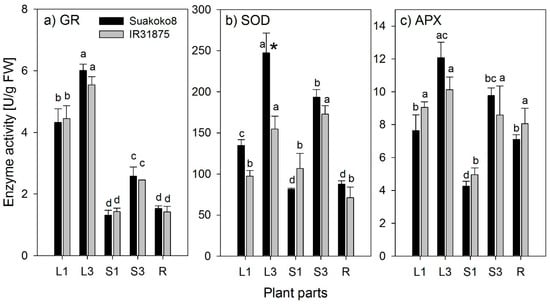 Enzyme activity of (a) glutathione reductase (GR), (b) superoxide dismutase (SOD), and (c) ascorbate peroxidase (APX), measured fresh for 2 varieties, Suakoko8, black, and IR31785, grey, L1 = the leaf blade and S1 = the sheath of the youngest fully developed leaf of the main culm; L3 and S3 = the blade and sheath of the third youngest fully developed leaf of the main culm; R = root. Error bars = standard error of mean (n = 3), asterisk depicts significant differences between varieties, different letters show significant differences between plant parts within the same variety (LSD test, p < 0.05).