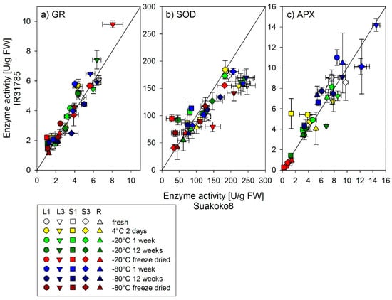 Enzyme activity of (a) glutathione reductase (GR), (b) superoxide dismutase (SOD), and (c) ascorbate peroxidase (APX), for 2 varieties, Suakoko8 and IR31785, L1 = the leaf blade and S1 = the sheath of the youngest fully developed leaf of the main culm; L3 and S3 = the blade and sheath of the third youngest fully developed leaf of the main culm; R = root. Storage treatments are shown in different colors. The line in the subgraphs shows the 1:1 relation. Error bars = standard error of mean (n = 3).