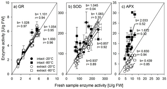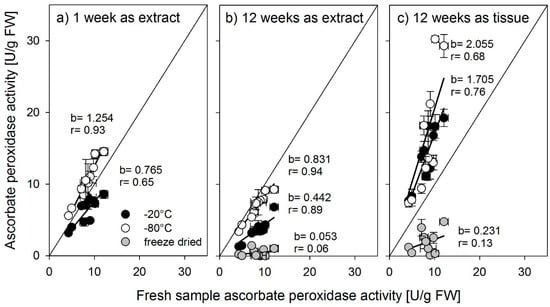 Ascorbate peroxidase activity determined from fresh samples compared with activity determined after storage at −20 °C, (black symbols), −80 °C (open symbols), or freeze-dried extracts of tissue (gray symbols) for (a) 1 week storage time or (b,c) 12 weeks storage time. b = slope of the regression line, r = the correlation coefficient r2. Error bars = standard error of mean (n = 3).