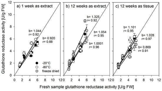 Glutathione reductase activity determined from fresh samples compared with activity determined after storage at −20 °C, (black symbols), −80 °C (open symbols), or freeze-dried extracts of tissue (gray symbols) for (a) 1 week storage time or (b,c) 12 weeks storage time. b = slope of the regression line, r = the correlation coefficient r2. Error bars = standard error of mean (n = 3).