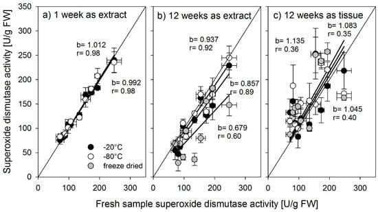 Superoxide dismutase activity determined from fresh samples compared with activity determined after storage at −20 °C, (black symbols), −80 °C (open symbols), or freeze-dried extracts of tissue (gray symbols) for (a) 1 week storage time or (b,c) 12 weeks storage time. b = slope of the regression line, r = the correlation coefficient r2. Error bars = standard error of mean (n = 3).