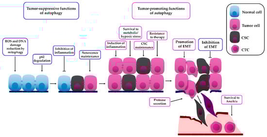 The role of autophagy in cancer. Autophagy functions as a tumor-suppressing process in normal cells by removing damaged proteins and organelles, maintaining low reactive oxygen species (ROS) levels by mitochondria elimination and decreasing DNA damage and genome instability. Autophagy also degrades p62, the accumulation of which is known to induce pro-tumorigenic signaling and induce inflammation. Once transformation has occurred, autophagy can also maintain cellular senescence to avoid the proliferation of transformed cells. On the other hand, once a tumor is established, tumor cells use autophagy as a survival mechanism to survive metabolic stress and hypoxia, to maintain tumor-related inflammation, to maintain cancer stem cell (CSC) survival, and to survive to cancer therapy. Additionally, during the invasion process, autophagy has been shown to be necessary for metalloprotease secretion, for degradation of the extracellular matrix, and for survival to anoikis in circulating tumor cells (CTCs). Evidence suggests that autophagy could also have a dual role in the regulation of EMT, and that inhibition of autophagy might be beneficial for some patients, since it would eliminate autophagy-dependent tumor cells and avoid invasion.