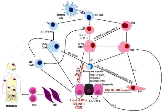 Tumors are complex structures comprised of cancer cells and other cell types which are recruited to the tumor site and influenced by their presence in the tumor. Non-malignant cells in the tumor microenvironment include cells of the immune system, cells from the tumor vasculature, and lymphatics, fibroblasts, pericytes, and adipocytes [86]. In this setting, inter-cellular communication creates a complex network of interactions between malignant and non-transformed cells, mostly mediated by extracellular protein secretion (cytokines, chemokines, growth factors, and inflammatory and matrix remodeling enzymes) and inter-cellular signaling (Figure 3). Immune cells in the tumor microenvironment include T and B lymphocytes, natural killer (NK and NKT) cells, tumor-associated macrophages (TAMs), myeloid-derived suppressor cells (MDSCs), dendritic cells, and tumor-associated neutrophils (TANs) [86], which, along with tumor cells, are the major source of cytokines and chemokines in the tumor microenvironment.