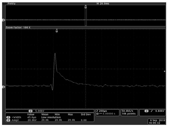 The voltage waveform recorded at center point of 20 kV, 45 μs.