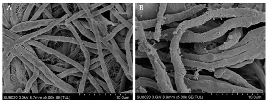 Figure 2A shows the TEM image of R. solani without PEF treatment. It can be observed that the appearance of mycelia was regular and complete, the distribution was even, and the surface of mycelia was smooth and flat without cracks. Figure 2B shows the TEM image of R. solani after PEF treatment. The visible mycelium phenotype was significantly changed, and the surface of the mycelium was uneven, with uneven cracks and a large number of buds. According to this, the cell membrane may be partially damaged, which may lead to the overflow of cell contents, and if the overflow exceeds a certain threshold, it may lead to apoptosis or death.