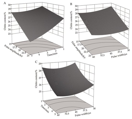 The response surface analysis results showed that the content of chitin decreased significantly with the increase of pulse voltage amplitude and processing time (P < 0.01). More specifically, at first, it decreased sharply and then recovered slowly with the increase of pulse width—however the effect was not significant. This is similar to the result obtained through the analysis of theoretical formula (4) [19]: