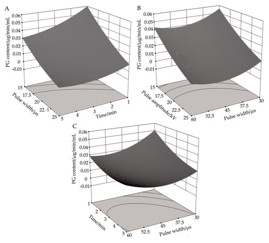 Figure 4C shows the response surface plot of pulse width and processing time to PG activity when the pulse voltage amplitude was 20 kV. It can be seen that, when the pulse voltage amplitude was at its central value, the PG activity decreased with the increase of processing time under different pulse widths, and the two factors exhibited a negative correlation trend. With the increase of pulse width, the PG activity at first decreased gradually and then increased slowly at different treatment time points. When the pulse width was 45.47 μs and the processing time was 4.70 min, the PG activity reached a minimum value of 0.01179, which was 80.02% lower than that in the control group.