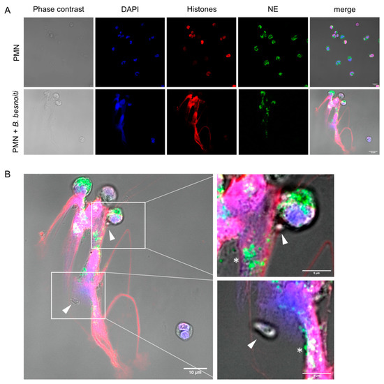 B. besnoiti tachyzoites induce neutrophil extracellular traps (NETs). 2 × 105 bovine polymorphonuclear neutrophils (PMN) were confronted with plain medium (control) or 8 × 105 B. besnoiti tachyzoites (1:4 ratio) for 3 h at 37 °C and 5% CO2. Samples were fixed and immune-stained for neutrophil elastase (green) and histones (red). The coverslips were mounted in mounting media containing 4′,6-Diamidine-2′-phenylindole DAPI to stain DNA (blue). Representative image of NETs in response to B. besnoiti tachyzoites is shown in (A). In (B) a zoom shows the detail of NETs trapping B. besnoiti tachyzoites (white triangle). In addition, the dotted distribution of neutrophil elastase in NETs is observed (white asterisk).