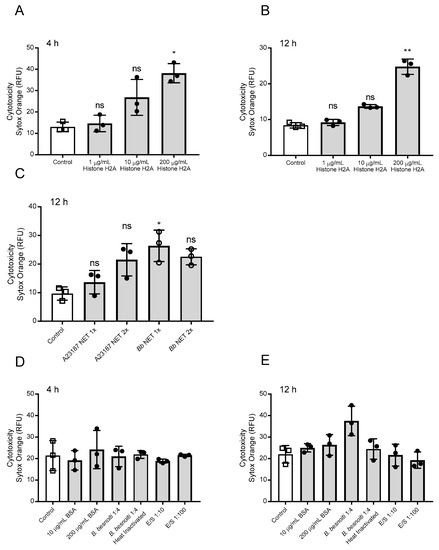 Histone 2A (H2A) and NETs preparations induce cell death in bovine umbilical vein endothelial cells (BUVEC). Three different BUVEC isolates were treated with H2A at concentrations of 1–200 µg/mL for 4 (A) h and 12 (B) h and with NETs preparations from bovine PMN confronted with B. besnoiti tachyzoites (Bb NET) or stimulated with A23187 (A23187 NET) for 12 h (C). For control purposes BUVEC were incubated with bovine serum albumin (BSA), heat killed, and viable B. besnoiti tachyzoites and excretory/secretory (E/S) molecules for 4 h (D) and 12 (E) h. Cell death was evaluated using Sytox Orange® staining. Bars represent mean ± SD. Statistical significance (ns = non-significant, * p < 0.05; ** p < 0.01; p < 0.001) was determined by Kruskal-Wallis test followed by a Dunn’s post-test comparing experimental versus control conditions (N = 3), all experiments were performed in duplicates.