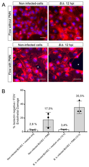 PMN induce damage on B. besnoiti-infected BUVEC under physiological flow conditions. PMN or medium alone were perfused at a constant shear stress of 1 dyn/cm2 over B. besnoiti-infected and non-infected BUVEC at 12 h.p.i. After 5 min of perfusion, cell layers were fixed and stained with DAPI for nuclei and with Alexa Fluor 594-conjugated isolectin-IB4 that predominantly binds endothelium and observed under fluorescence microscopy. Endothelial damage is calculated dividing the isolectin-negative surface (white asterisks, A, representative images) by the total surface of the field of view. Column graph represents results of the percentage of endothelial damage after analyzing five random pictures from three different BUVEC isolates per each experimental condition (B). FOV = Field of view. Number over the bars indicates the mean % and error bars ± SD.
