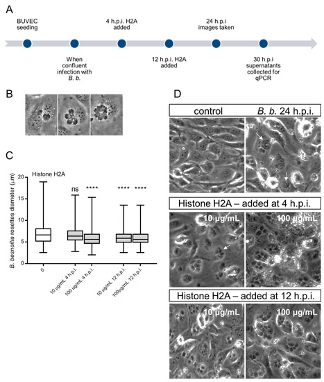 Histone 2A (H2A) treatment of B. besnoiti-infected BUVEC reduces B. besnoiti parasitophorous vacuole (PV) diameter. BUVEC (three different isolates, N = 3) were treated with H2A at 10 or 100 µg/mL at 4 and 12 h.p.i. (for experimental procedure refer to Figure 4A). At 24 h.p.i. experimental conditions were documented by five randomly taken images using a phase contrast microscope (B,D). (B) Shows the typical development of B. besnoiti rosettes within 24 h of infection (non-synchronous tachyzoite division leads to the formation of 2-mers to 16-mers). Here, the diameter of each B. besnoiti PV was measured (n = 825) and plotted as box and whiskers plot (C), line at median, bars indicating maximum and minimum values. Statistical significance, N = 3 (ns = non significant, **** p < 0.0001) was determined by Kruskal-Wallis test followed by a Dunn´s post-test comparing experimental versus control condition at 4 and 12 h.p.i. In (D) a representative image of each experimental condition is shown, white arrows indicate B. besnoiti rosettes inside host BUVEC cell.
