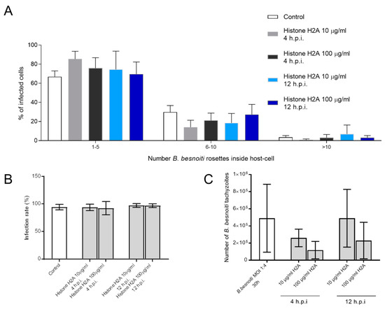 Histone 2A (H2A) did not affect the number of intracellular B. besnoiti rosettes. B. besnoiti-infected BUVEC (three different isolates, N = 3) were treated with H2A (10 or 100 µg/mL) at 4 and 12 h.p.i. At 24 h.p.i. cell layers were analyzed by randomly taking five microscopic images using phase contrast microscopy. The total number of B. besnoiti rosettes per host cell was determined and the percentage of host cells carrying different numbers of PV was estimated and sub-grouped in different categories (with 1–5, 6–10 and >10 rosettes/cell, respectively; (A)). Furthermore, the infection rate (B) and the total number of tachyzoites being released into cell supernatant within 30 h.p.i. was estimated via qPCR (C). Bar graph shows mean ± SD. (n = 238).