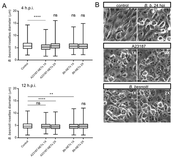 Bb-NETs and A231887-NETs induced a decrease in rosette diameter in B. besnoiti-infected BUVEC. Bb-NETs or A231887-NETs were added at two different concentrations (1X and 2X) to infected BUVEC cells (three different isolates, N = 3) at 4 (A, upper panel) and 12 (A, lower panel) h.p.i. At 24 h.p.i. experimental conditions were documented within five random pictures using a phase contrast microscope and the diameter of B. besnoiti rosettes was determined (n = 1115). Box and whiskers plot, line at median, bars indicating maximum and minimum values. Statistical significance was determined by Kruskal-Wallis test followed by a Dunn´s post-test comparing experimental versus control condition at 4 and 12 h.p.i. (A). Representative images infected BUVEC cells to which Bb and A23187 NETs were added at 12 h.p.i. are shown (B). ns = non significant, ** p < 0.01, **** p < 0.0001.