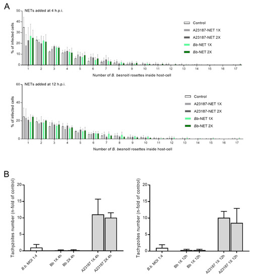 Effects of Bb-NET and A23187-NET treatments on intracellular B. besnoiti rosettes formation and tachyzoite release. B. besnoiti-infected BUVEC (three different isolates, N = 3), were treated with Bb-NETs or A231887-NETs at 1X and 2X concentrations at 4 and 12 h.p.i. All treatments were performed in duplicates. At 24 h.p.i. cells were analyzed by randomly taking five images for each experimental condition using phase contrast microscopy. The total number of B. besnoiti rosettes per host cell at 4 (n = 1115) and 12 h.p.i. (n = 970) was determined and the percentage of host cells carrying different numbers of rosettes was calculated (A) In addition, the total number of tachyzoites being released into cell supernatant within 30 h.p.i. was estimated via qPCR (B). Bars represents mean ± SD.