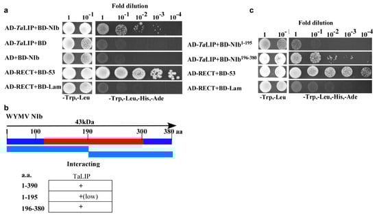 Interaction of Wheat yellow mosaic virus (WYMV)NIb with and TaLIP in a yeast two-hybrid analysis. (a) NIb was fused to the DNA-binding domain and TaLIP was fused to the activation domain (AD-TaLIP), co-transformed into yeast cells, and then coated uniformly on selection plates of SD/-Trp, -Leu, -Ade, -His solid medium. Positive and negative controls were co-transformed with AD-T/BK-53 and AD-T/BK-Lam, respectively. (b) NIb was divided into two parts and fused to the DNA-binding domain, co-transformed with AD-TaLIP into yeast cells, and then coated uniformly on selection plates of SD/-Trp, -Leu, -Ade, and -His solid medium. AD-T/BK-53 and AD-T/BK-lam were used as the positive control and negative control, respectively. (c) Illustration of the WYMV NIb sequence, which divided into two segments and summary of TaLIP interactions with WYMV NIb. The red region represents the conserved domains of NIb.