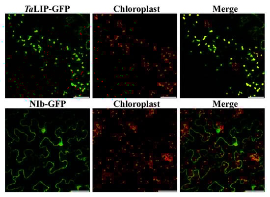 Localization of the TaLIP and WYMV NIb protein in Nicotiana benthamiana leaves agroinfiltrated with pENTR-NIb-GFP or pENTR-TaLIP-GFP. The green fluorescent signal of TaLIP proteins was co-localized with the red auto-fluorescent signal of chloroplasts. Fluorescence photographs were taken at 3 dpi. Scale bar: 50 μm.
