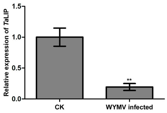 The expression level of TaLIP was significantly downregulated in WYMV-infected wheat. TaCDC was used as the internal control. The level of TaLIP in health wheat was normalized to 1. Each relative expression level is presented as the mean ± SD from four biological samples and each biological sample had four technical replicates. Statistical analyses were done using the Student’s t-test. Asterisks indicate a significant difference when compared to the control. * p < 0.05; ** p < 0.01.