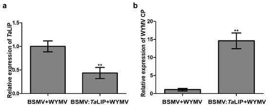 To investigate the relationship between TaLIP expression and WYMV infection in wheat, we inoculated six wheat seedling with an RNA transcript representing BSMV + WYMV or BSMV:TaLIP + WYMV. After 7 dpi, we analyzed the silencing level of the TaLIP gene in the BSMV:TaLIP + WYMV co-inoculated wheat seedling through qRT-PCR using TaLIP specific primers. The results showed that the TaLIP transcript level in the plants co-inoculated with BSMV:TaLIP + WYMV were better silenced (p < 0.01) than the plants co-inoculated with BSMV + WYMV (Figure 6a). Then, the expression level of WYMV CP was also detected by qRT-PCR using the CP specific primers in these plants. The results showed that the expression level of WYMV CP was detected by qRT-PCR and the WYMV CP expression level of BSMV:TaLIP + WYMV inoculated wheat was significantly higher than the inoculated wheat (BSMV + WYMV) (Figure 6b). These results suggest that knockdown of TaLIP impaired host resistance.