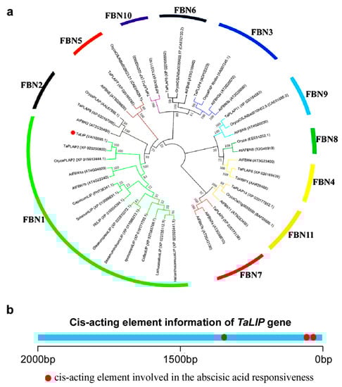 The TaLIP protein belongs to the FBN1 (fibrillin family) and have three copies of the abscisic acid (ABA) responsive element. (a) Phylogenetic analysis of TaLIP and the construction of the evolutionary tree utilizing MEGA4 program [24]. The 11 distinct subfamilies were designated as 1~11 and labeled with different colored branches respectively. (b) promoter Cis-acting element prediction analysis of TaLIP.