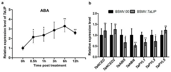 To determine how TaLIP responds to exogenous applications of hormones, we investigated the transcription profiles of TaLIP in wheat treated with ABA. After ABA treatment, expression was induced from 0.5 to 12 h post-treatment (hpt), rapidly increased to 2.15-fold at 0.5 hpt, reached a peak at 6 hpt (about 3.29-fold that of nontreatment), then decreased to 2.60-fold higher than the nontreated control (N) from 6 to 12 hpt (Figure 8a). These results suggest that TaLIP transcription was induced by exogenous ABA stimuli. Next, we investigated the expression of mRNA level of the ABA-related genes including the ABA biosynthetic pathway gene TaNCED, TaNCED2, and the ABA signaling pathway gene TaABI5, TaABI8, TaPYL1, TaPYL3, and TaPYL5 in TaLIP-silenced wheat (Figure 8b). The transcription level of TaABI5, TaABI8, TaPYL1, and TaPYL3 were suppressed in TaLIP-silenced wheat.