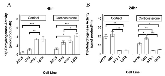 11β-dehydrogenase activities in four pituitary cell lines measured over (A) 4 h or (B) 24 h using 100 nM [3H]-cortisol and 100 nM [3H]-corticosterone as enzyme substrates. Data shown are mean ± SEM for three different cell passages pooled together (n = 3) (with triplicate measures in each passage). For a given time point and substrate, mean values with different superscripts differ significantly (p < 0.05) (one-way ANOVA with the Tukey–Kramer multiple comparison as the post hoc test).