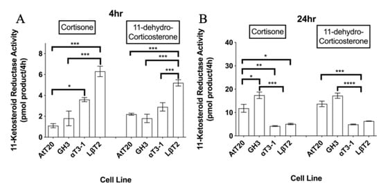 11-ketosteroid reductase activities in four pituitary cell lines measured over (A) 4 h or (B) 24 h using 100 nM [3H]-cortisone and 100 nM [3H]-11-dehydrocorticosterone as enzyme substrates. Data shown are mean ± SEM for three different cell passages pooled together (n = 3) (with triplicate measures in each passage). For a given time point and substrate, mean values with different superscripts differ significantly (p < 0.05) (one-way ANOVA with the Tukey–Kramer multiple comparison as the post hoc test).