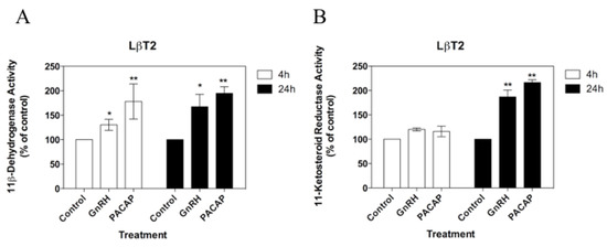 Effects of GnRH and PACAP on (A) 11β-dehydrogenase and (B) 11-ketosteroid reductase activities in LβT2 cells over 4 h and 24 h using 100 nM [3H]-cortisol and 100 nM [3H]-cortisone as enzyme substrates. Values are mean ± SEM for three different cell passages (with triplicate measures in each passage). For each time point and enzyme activity, * p < 0.05 and ** p < 0.01 versus corresponding control. Data shown are normalised as a percentage of the corresponding control enzyme activity in the absence of treatments (ranging from 2.4 to 4.5 pmol product/4 h for 11β-dehydrogenase activity, and from 5.4 to 7.2 pmol product/4 h for 11-ketosteroid reductase activity). Non-normalised data were analysed by one-way ANOVA with the Dunnet’s multiple comparison as the post hoc test).