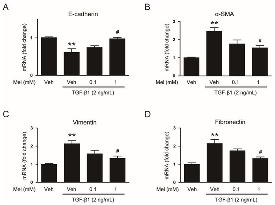Effects of melatonin on mRNA expression of epithelial–mesenchymal transition (EMT) markers in transforming growth factor-β1 (TGF-β1)-treated hepatocytes. AML12 hepatocytes were preincubated with melatonin (Mel; 0.1 mM or 1 mM) or vehicle (Veh; 0.1% dimethyl sulfoxide) for 30 min and then treated with TGF-β1 (2 ng/mL) for 48 h. Relative mRNA levels of E-cadherin (A), α-smooth muscle actin (α-SMA) (B), vimentin (C), and fibronectin (D). All data are presented as the mean ± standard error of the mean (SEM). ** p < 0.01 vs. vehicle-treated cells (Veh). # p < 0.05 vs. cells treated with TGF-β1 alone.