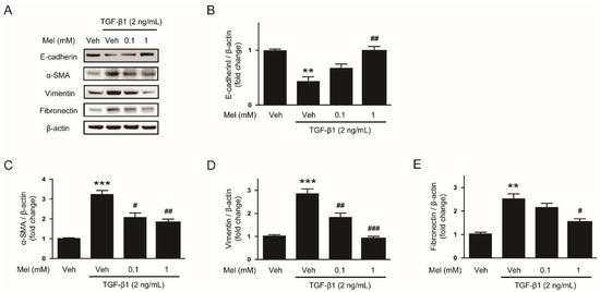 Effects of melatonin on protein levels of EMT markers in TGF-β1-treated hepatocytes. AML12 hepatocytes were preincubated with melatonin (Mel; 0.1 mM or 1 mM) or vehicle (Veh; 0.1% dimethyl sulfoxide) for 30 min and then treated with TGF-β1 (2 ng/mL) for 48 h. (A) Western blot image of the expression of E-cadherin, α-SMA, vimentin, fibronectin, and β-actin. The graphs show densitometric quantification of E-cadherin (B), α-SMA (C), vimentin (D), and fibronectin (E) normalized against β-actin. All data are presented as the mean ± SEM. ** p < 0.01 and *** p < 0.001 vs. vehicle-treated cells (Veh). # p < 0.05, ## p < 0.01, and ### p < 0.001 vs. cells treated with TGF-β1 alone.