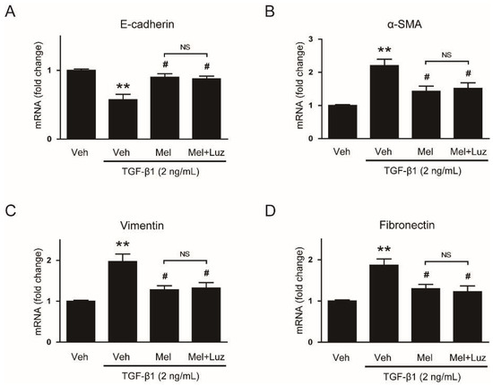 Effects of luzindole on mRNA expression of EMT markers in TGF-β1-treated hepatocytes preincubated with melatonin. AML12 hepatocytes were preincubated with melatonin (Mel; 1 mM) or vehicle (Veh; 0.6% dimethyl sulfoxide) for 30 min in the presence or absence of luzindole (Luz; 100 μM) and then treated with TGF-β1 (2 ng/mL) for 48 h. Relative mRNA levels of E-cadherin (A), α-SMA (B), vimentin (C), and fibronectin (D). All data are presented as the mean ± SEM. ** p < 0.01 vs. vehicle-treated cells (Veh). # p < 0.05 vs. cells treated with TGF-β1 alone. NS: not significant.