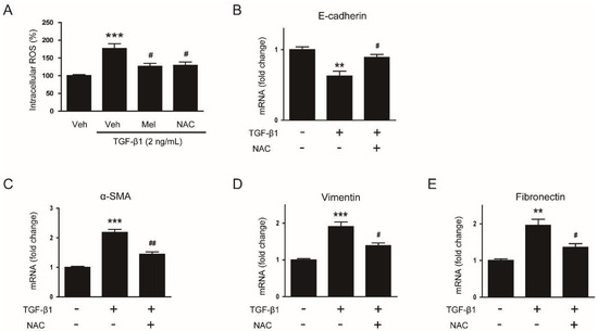 Effects of N-acetylcysteine (NAC) on reactive oxygen species (ROS) generation and mRNA expression of EMT markers in TGF-β1-treated hepatocytes. (A) AML12 hepatocytes were preincubated with melatonin (Mel; 1mM), NAC (10 mM), or vehicle (Veh; 0.1% dimethyl sulfoxide) for 30 min and then treated with TGF-β1 (2 ng/mL) for 48 h. Intracellular ROS was measured using the 2′,7′-dichlorodihydrofluorescein diacetate assay. *** p < 0.001 vs. vehicle-treated cells (Veh). # p < 0.05 vs. cells treated with TGF-β1 alone. (B–E) AML12 hepatocytes were preincubated with NAC (10 mM) for 30 min and then treated with 2 ng/mL TGF-β1 for 48 h. Relative mRNA levels of E-cadherin (B), α-SMA (C), vimentin (D), and fibronectin (E). All data are presented as the mean ± SEM. ** p < 0.01 and *** p < 0.001 vs. non-treated cells. # p < 0.05 and ## p < 0.01 vs. cells treated with TGF-β1 alone.