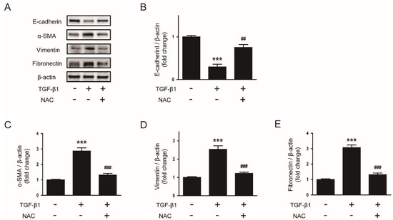 We next evaluated whether the antioxidant NAC can also prevent EMT stimulated by TGF-β1 in AML12 cells. Pretreatment with NAC significantly reversed the changes in mRNA levels of E-cadherin (Figure 7B), α-SMA (Figure 7C), vimentin (Figure 7D) and fibronectin (Figure 7E) after TGF-β1 stimulation. Western blotting confirmed that protein levels of the EMT markers were also significantly reversed by NAC (Figure 8A–E). Collectively, these findings suggest that the compound significantly inhibits EMT stimulated by TGF-β1 in AML 12 hepatocytes.