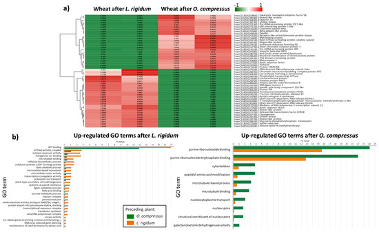 Differentially expressed genes in wheat roots at 1 week post-planting, according to the preceding plant species, in the Undisturbed regime. (a) Heatmap of the top 50 differentially expressed wheat genes between the Undisturbed L. rigidum and O. compressus treatments (green indicates down-regulated genes, red indicates up-regulated genes); and, (b) Comparison of the distribution of GO terms in wheat after L. rigidum and wheat after O. compressus.