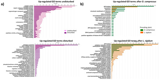 GO enrichment of differentially expressed genes in wheat root at five weeks post-planting, between the Undisturbed and Disturbed regimes (a), or according to the preceding plant species (O. compressus or L. rigidum) in the Undisturbed regime (b).