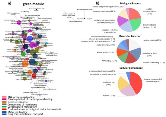 (a) Network visualization of interactions between wheat genes in the “green” module, related to L. rigidum. Larger nodes correspond to hub genes. (b) Pie-charts of GO terms distribution of genes in the “green” module belonging to the Biological Process, Molecular Function, and Cellular Component classes.