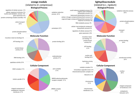 GO enrichment of R. irregulare genes in the “orange” and “lightyellow” modules in the Biological Process, Molecular Function and Cellular Component classes. “orange” module shows genes related to O. compressus, and “lightyellow” module contains genes connected to L. rigidum.