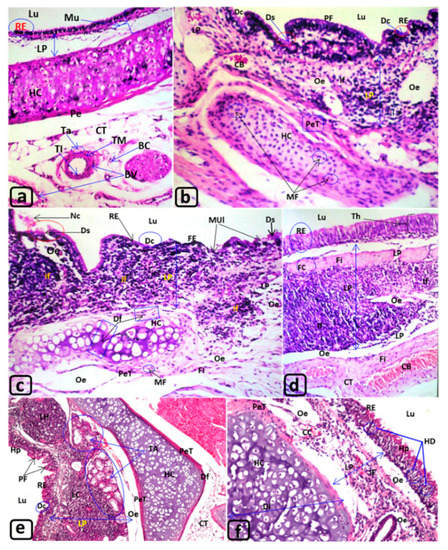 T. S., Trachea of the rat: (a) G1 “control”; (b–d) G2 exposed for 3 months; (e,f) G3 exposed for 6 months. H&E. (Table 2). Lu: Lumen of control trachea clear from abnormal secretion of any cellular debris. RE: The lining tissue called mucosa (Mu), formed of respiratory epithelium (RE) and the underneath connective tissue, lamina propria (LP). HC, CT and BV: The submucosal layer involved hyaline cartilage (HC) that covered with perichondrium (Pe) sheath and the peritracheal CT surrounded the trachea with numerous blood vessels (BV) that showed normal tunica intima (TI), tunica media (muscularis) (TM), and tunica adventitia (Ta) consisted of substantial sheath of CT, as well as normal blood capillaries (BC). BV: blood vessel; CT: peritracheal connective tissue; HC: hyaline cartilage; LP: lamina propria; Lu: lumen of trachea; RE: respiratory epithelium. Magnifications ×40. H&E. Figure 1b–d: trachea of rats (G2) exposed to MTBE at 60 µL/3 min/day, for 3 months. Figure 1b–d: Lu: Lumen (Lu) showed the presence of eosinophilic debris formed from the necrotic epithelial cells (Nc), Figure 1c. RE: The respiratory epithelium (RE) displayed deciliation (Dc), desquamation (Ds), polyp’s formation (PF) mucosal ulceration (MUl), which deformed into flattened squamous epithelium (FE) “metaplasia” (Figure 1b,c) and/or thickening (Th) “hyperplasia” (Figure 1d). LP: demonstrated congested blood vessel (CB); diffuse accumulation of inflammatory cells infiltrations (If), edema (Oe) (Figues 1b–d), as well as, fibroid changes (Fi) with the presence of few foam cells (FC) (Figure 1d). HC: indicated mitotic figures (MF) with thickened perichondrium (PeT) (Figure 1b) and deformation (Df) (Figure 1c). CT and BV: the peritracheal CT illustrated fibroid changes (Fi) besides severs dilatation and congestion of some blood vessels (CB). Magnifications (Figure 1b–d: ×40). H&E. Figure 1e,f: trachea of rats (G3) exposed to MTBE at 60 µL/3 min/day, for 6 months. Lu: showed, also, the presence of eosinophilic debris and necrotic epithelial cells, but not shown in the present Figure 1e,f. RE: showed deciliation (Dc), hyperplasia (Hp), polyp’s formation (PF) (Figure 1e), and hydropic degeneration (HD) (Figure 1f). LP: more alteration was observed such as: aggregation of lymphoid cells (LC), lymphoid hyperplasia, and accretion of tracheal adenomas (TA) (Figure 1e) and edema (Oe) (Figure 1e,f) with dilatation and congestion in the blood capillaries (CC) (Figure 1f). HC: LP: more alteration was observed such as: aggregation of lymphoid cells (LC), lymphoid hyperplasia, and accretion of tracheal adenomas (TA) (Figure 1e) and edema (Oe) (Figure 1e,f) with dilatation and congestion in the blood capillaries (CC) (Figure 1f). presented deformation (Df) due to outward protrusion with perichondrial thickening (PeT) (Figure 1e,f) and increased its diameter (Figure 1f). CT and BV: The peritracheal CT showed the same alteration observed in Figure 1b–d, not shown in the present Figure 1e,f. Magnifications (Figure 1e, ×16 and 1f ×40), H&E.
