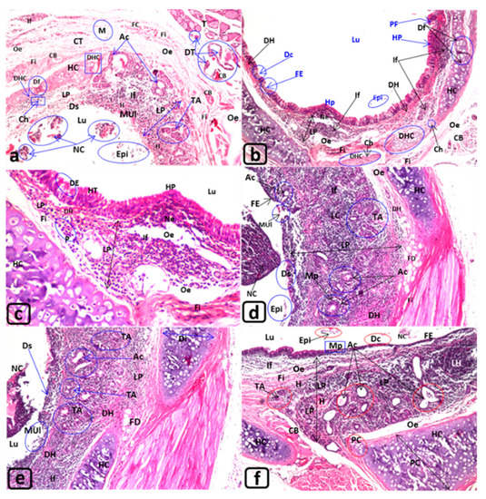 T. S., Trachea of the rat: (a–f) G4 exposed for 12 months. H&E. (Table 2). Figure 2a–f: trachea of rats (G4) exposed to MTBE at 60 µL/3 min/day, for 12 months. Lu: illustrated epithelialization (Epi) and necrotic cells (NC) (Figure 2a,b,d–f). RE: showed severe desquamations (Ds) and mucosal ulceration (MUl) (Figure 2a,d,e), degeneration (DE) and hypertrophy (HT) (Figure 2e), and hyperplasia (HP) (Figure 2b,c) or flattened epithelia (FE) “metaplasia” (Figure 2b,d,f). LP: showed increase in size (Figure 2a–f: see bi-head arrow), focal hemorrhage (H) (Figure 2a,f), diffuse hemorrhage (DH) (Figure 2b–e), edema (Oe) (Figure 2a–d,f), fibroid changes (Fi) and inflammatory cells infiltrations (If) (Figure 2a–f), lymphocytic cell infiltration (LC) (Figure 2d), lymphoid hyperplasia (LH) (Figure 2f), furthermore, a small necrotic area (Ne) (Figure 2b,c), fatty degeneration (FD) (Figure 2d,e) with fibroid changes (Fi) (Figure 2a–d,f) and aggregation of plasma cells (P) (Figure 2c). Also, the LP revealed the formation of tracheal adenomas (TA) (Figure 2a,b,d,e) and some of them fused or grown to form large filled fluid large acini (Ac) (Figure 2a,d–f), with metaplasia (Mp) in their walls (Figure 2d). HC: revealed an increase in diameter (Di) or enlarged and protruded (PC) toward the outer and inner directions, but, the cartilage of other trachea displayed deformation (DF) and degeneration (DHC) with the presence of numerous chondroclasts (Ch), which may induce degeneration. CT, BVand T: The peritracheal CT, showed edema (Oe), fibroid degeneration (Fi) (Figure 2a,b) with fibrocytes (Figure 2a), dilated and congested blood vessels (CB) (Figure 2a,b), in addition, inflammatory cells infiltrations (If) and monocytic infiltration (M) (Figure 2a). T: The thyroid the thyroid gland (T) showed few degenerated thyroid follicles (DT) with congested blood vessels (CB) (Figure 2a). Magnifications (Figure 2a ×40; 2b ×16; 2c ×80; 2d–f ×40).