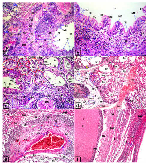 Furthermore, numerous degenerative changes, such as emphysematous changes (Em) with septal destruction of air alveoli (SD) and the incidence of degenerated alveoli (Da) lung adenoma (LA), were noticed (Figure 4c,d). Additionally, collapsed alveoli (CA) were observed along with the formation of large focal abscesses with central liquefaction (CL) surrounded by pyogenic membrane (PM) (Figure 4e,f).