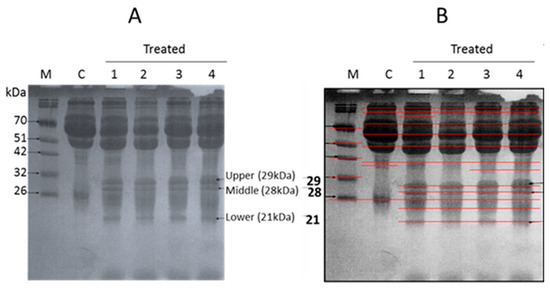 - Laemmli, U.K. Cleavage of structural proteins during the assembly of the head of bacteriophage T4. Nature 1970, 227, 680–685. [Google Scholar] [CrossRef]
