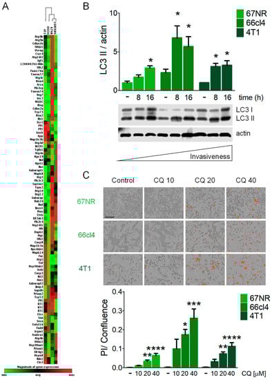 Triple Negative Breast Cancer (TNBC) cell lines with different metastatic capacities differ in basal levels of autophagy and sensitivity to autophagy inhibition. (A) Hierarchical clustering analysis of autophagy-related gene expression clustered cell lines according to their metastatic capacity (67NR, non-metastatic; 168FARN, weakly metastatic; 66cl4, metastatic only to lung; 4T1, highly metastatic). (B) LC3II accumulation was evaluated by Western blot for basal autophagy assessment using 10 µM chloroquine (CQ) at the indicated times. (C) Cell death evaluation with propidium iodide (PI) staining was assessed after 24 h of treatment with the indicated concentrations of CQ [µM]. The scale bar in the pictures in (C) represents 200 µm. Graphs shows mean +/− standard error of three to four independent experiments, * p < 0.05, ** p < 0.01, *** p < 0.001, **** p < 0.0001.