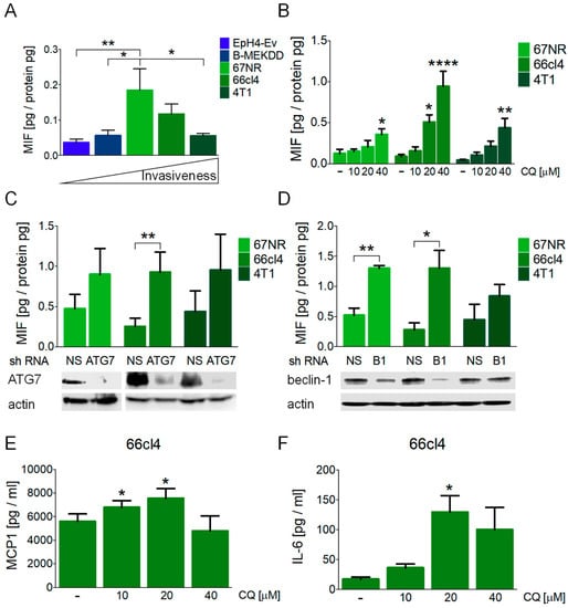 Autophagy inhibition induced the secretion of macrophage migration inhibitory factor (MIF) in breast cancer cell lines. (A) Basal secretion of MIF to the culture media was evaluated in the EpH4-Ev (mouse epithelial breast cells), B-MEKDD 116 (MEK1 transformed, tumorigenic cell line), 67NR (non-metastatic), 66cl4 (metastatic to lung) and 4T1 (highly metastatic) cell lines. Media was collected at 16 h. Autophagy inhibition with CQ treatment (B), ATG7 knockdown (C) or beclin-1 (B1) knockdown (D), all collected after 16 h, induced the secretion of MIF in the breast cancer cell lines studied. In (C,D), ATG7 or beclin-1 protein levels were evaluated by Western blot to confirm knockdown efficiency and are shown below the graphs. Autophagy inhibition with CQ treatment also induced the secretion of MCP-1 (E) and IL-6 (F) in the 66cl4 breast cancer cell line at 16 h. Graphs show mean +/− standard error of three-four independent experiments, * p < 0.05, ** p < 0.01, **** p < 0.0001. NS, non-silencing shRNA; B1, beclin-1.